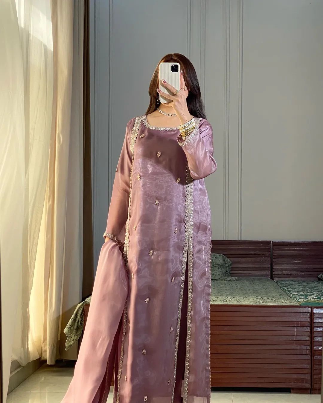 Unveiling Our Latest Designer Party Wear Look in Elegant Pur Jimmy Choo Silk! π¦ This stunning 3-piece set includes a heavily embroidered Top with 5mm Sequence Work, delicate Moti Hand Work, and Fancy Sleeves for that premium festive look. Paired with a fully stitched plazzo in the same luxurious fabric and a 2.20-meter dupatta adorned with a four-side fancy lace border, this outfit is the perfect blend of glamour and grace. Designed with comfort in mind, each piece is lined with soft Micro Cotton, making it ideal for weddings, parties, and festive occasions. Available in sizes M to XXL, this ensemble is ready to wear and made to turn heads wherever you go!